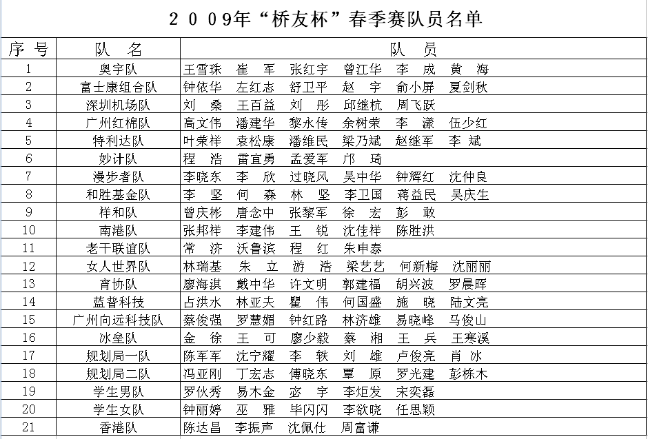 2009年“桥友杯”春季桥牌队式赛最后结果