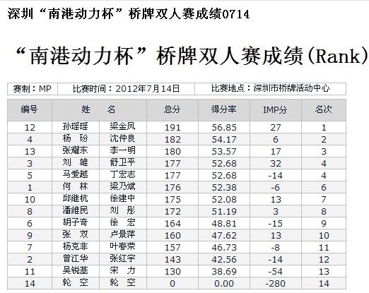 | 深圳“南港动力杯”桥牌双人赛成绩0714 | |
