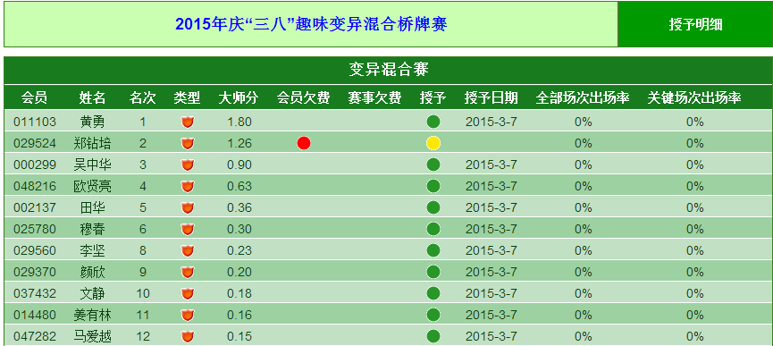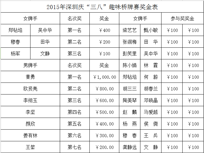 | 2015年庆祝“三八节”趣味桥牌赛成绩 | |