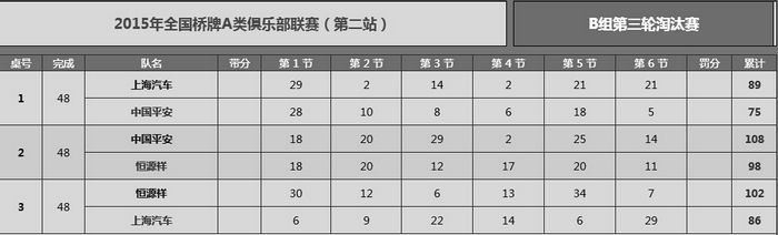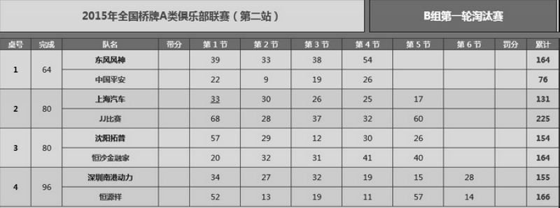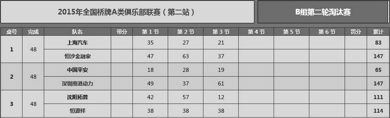 B组为分区淘汰赛,每场96副牌,分六节举行,节分决定胜负,B组将有2支队伍被暂停A俱资格