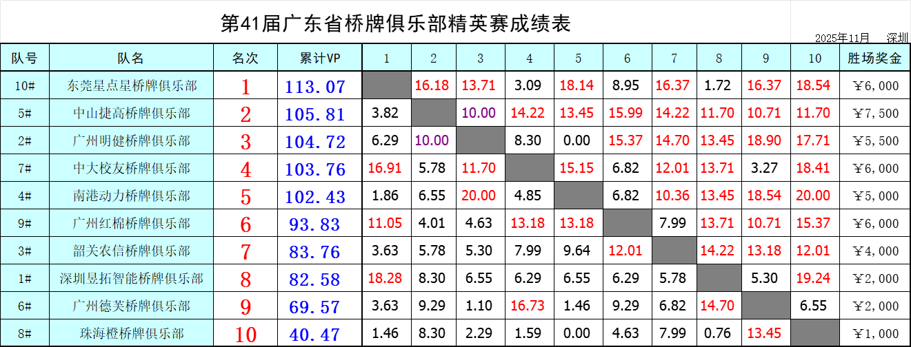 | 2025年第41届广东省桥牌俱乐部精英赛成绩 | |