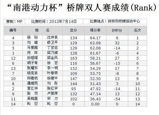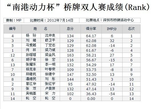 | 深圳“南港动力杯”桥牌双人赛成绩0714 | |